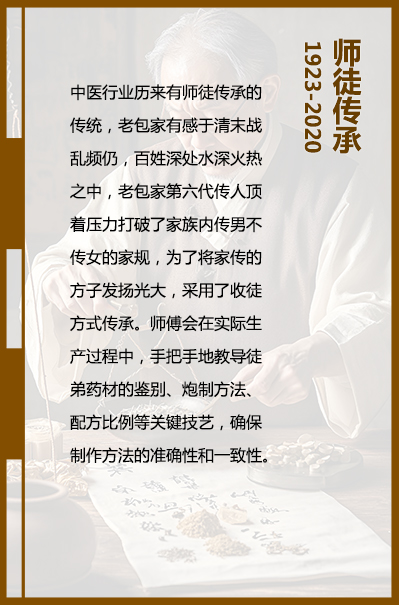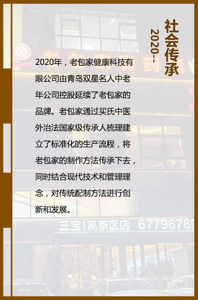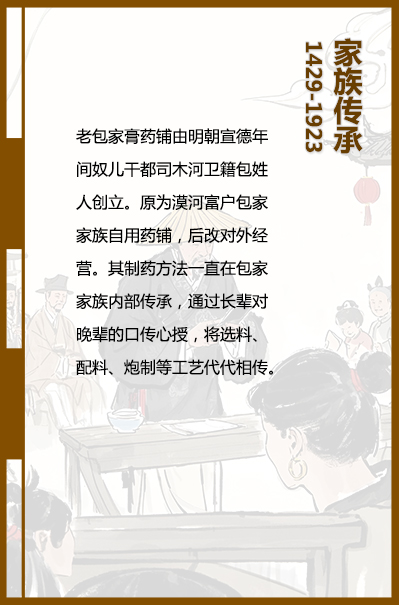 老包家膏药铺,源起于(1429年)明朝漠河奴儿干都司木河卫时期,伊始为漠河富户包家家族自用药 铺,后逐渐改对外经营。老包家制药工艺一直在家族内部传承,通过长晚辈之间的口传心授,将选料、配料、 炮制等技法代代相传……